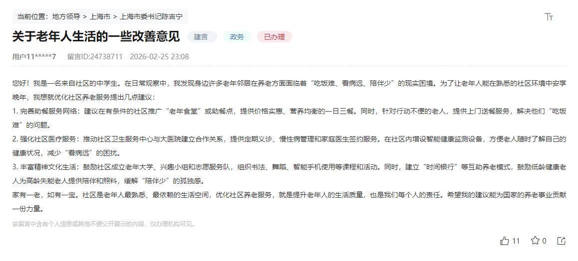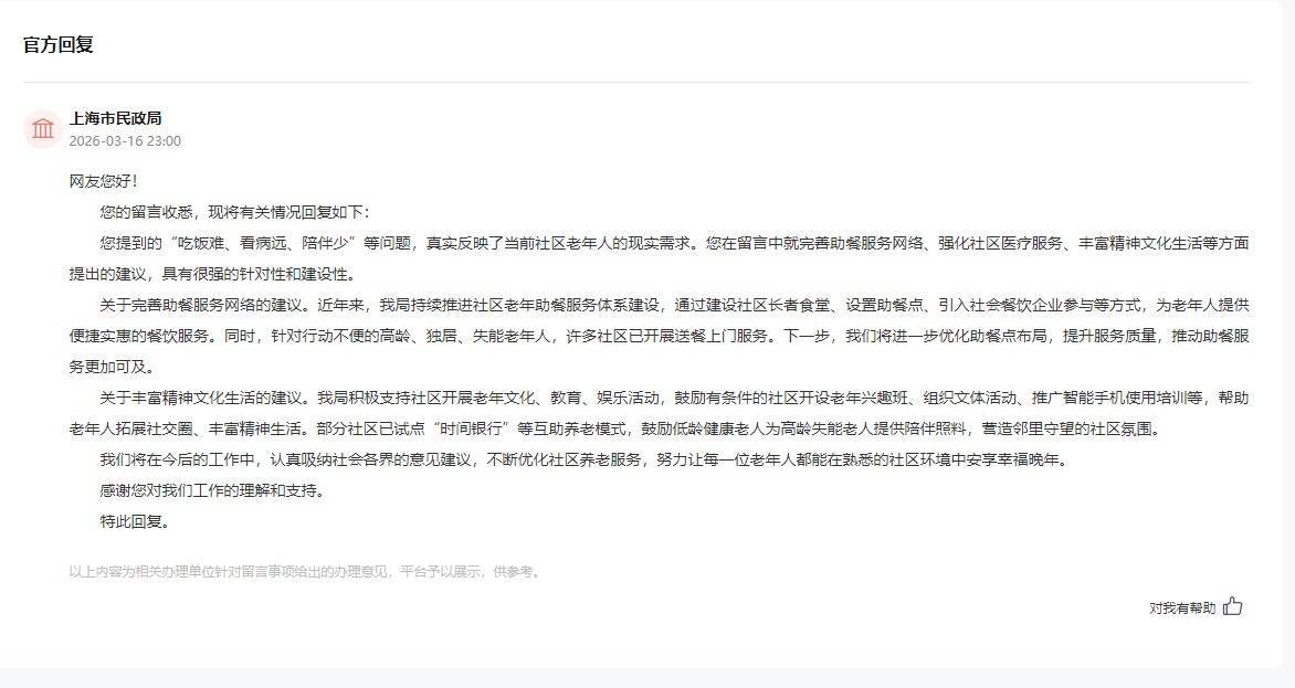 对此,上海市民政局表示,该网友提到的“吃饭难、看病远、陪伴少”等问题,真实反映了当前社区老年人的现实需求,建议具有很强的针对性和建设性。